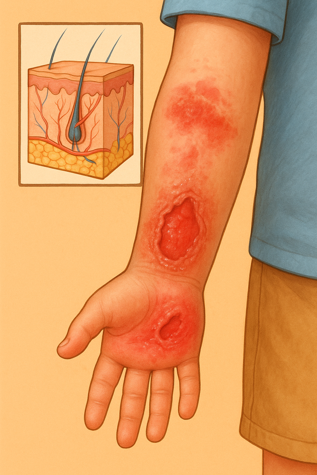 Neste tópico, você aprenderá a identificar as camadas da pele, reconhecer os diferentes graus de queimaduras e compreender por que as crianças são mais vulneráveis — além de dominar as condutas iniciais que fazem toda a diferença entre o agravamento e a recuperação segura.